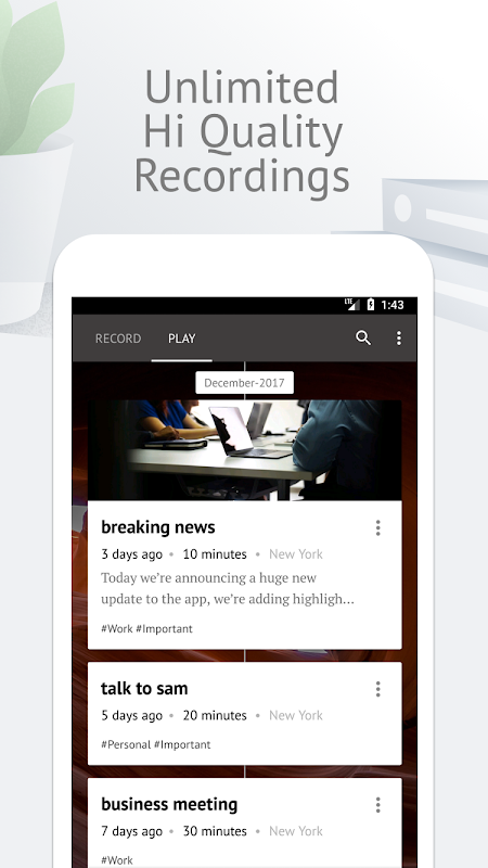 ★ این باعث می شود جستجو برای ضبط راحت تر از همیشه قبل از. سازماندهی ضبط صدا شما را با تگ های کار، مهم، مدرسه و حتی محل سکونت خود را، بنابراین پیدا کردن ضبط راست است که همیشه یک نسیم است.