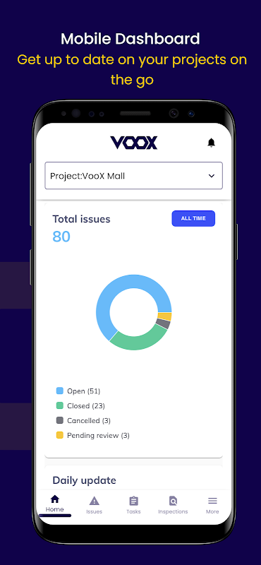 Voox empowers teams to collaborate and make proactive, data-led decisions for your construction projects and facility management portfolios. Create Issues when you discover them, assign and track their rectification progress across your teams and sites. Conduct Inspections with customized checklists to make sure standard procedures are followed.
