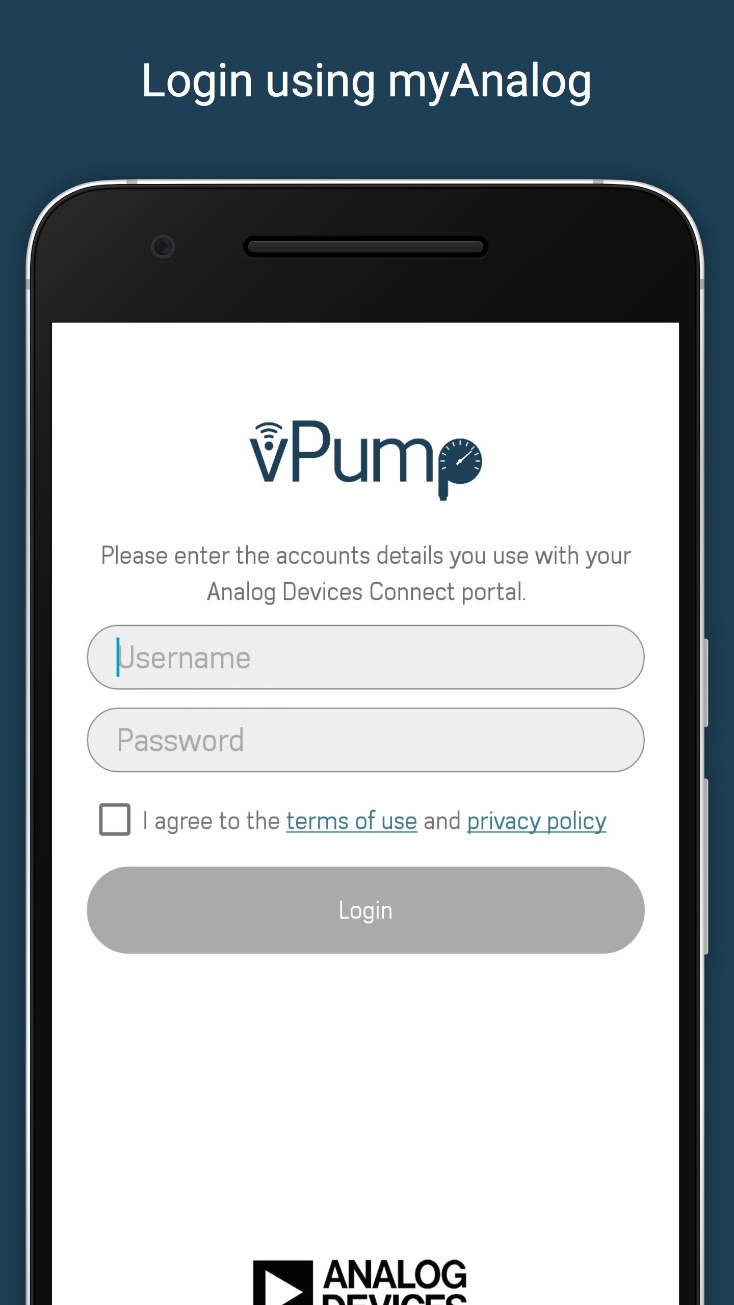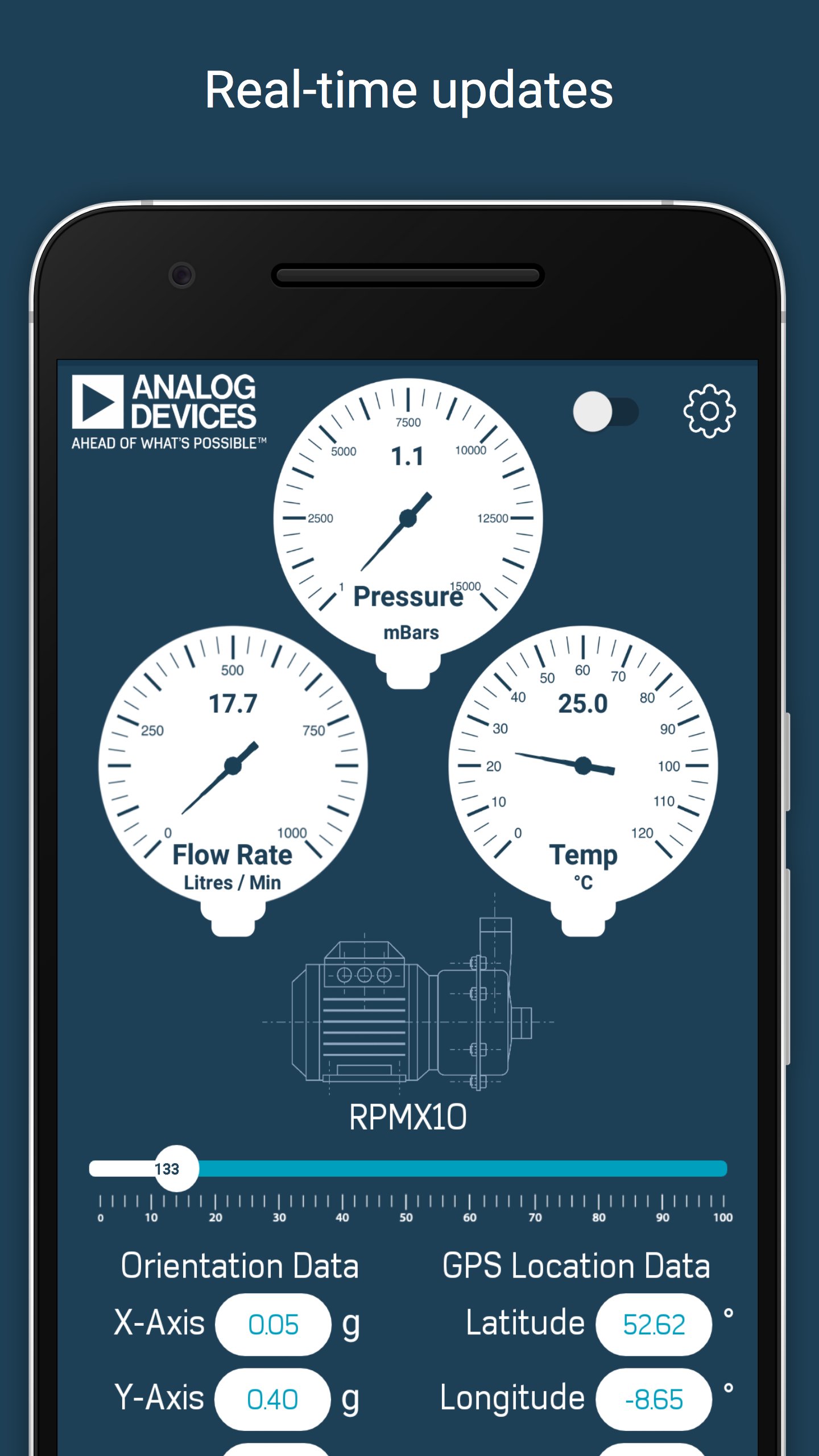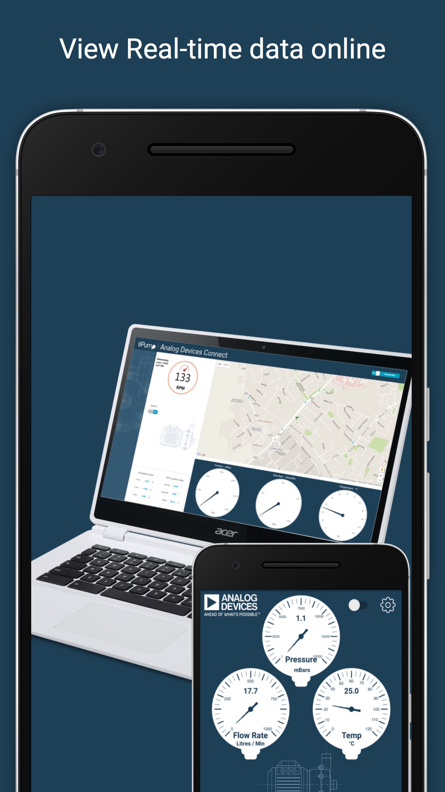 vPump simulates an industrial machine-monitoring solution allowing you to visualize reporting metrics, adjust machine controls, and create custom mashups in the Analog Devices Connect cloud application.