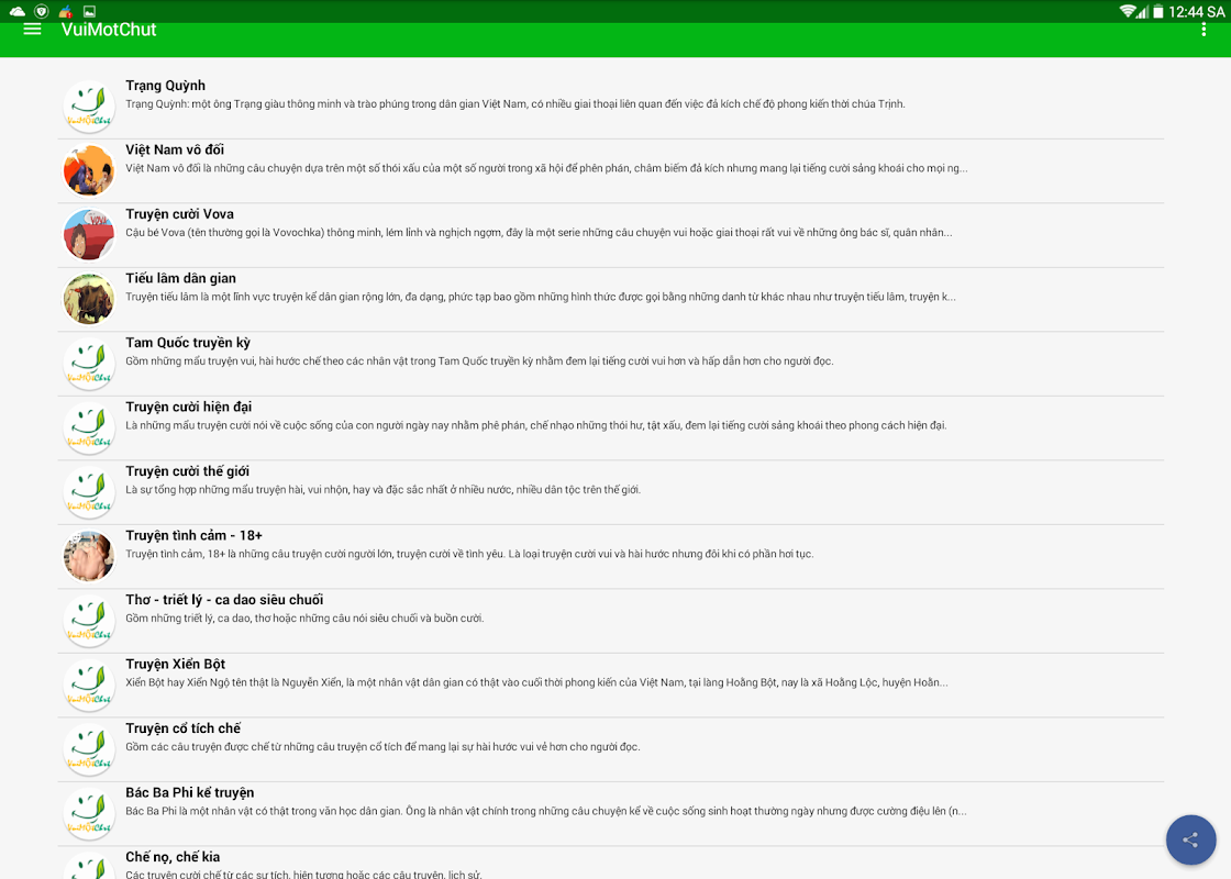 Phần mềm là sự chọn lọc những truyện cười, truyện tiếu lâm dân gian hay nhất việt nam và thế giới, những thể loại cười lăn lộn bò càng, cười kiểu vova, cười người lớn trẻ nhỏ, hoặc những thể loại truyện chế buồn cười, thể loại tế cười 18+ tế nhị, truyện vova.