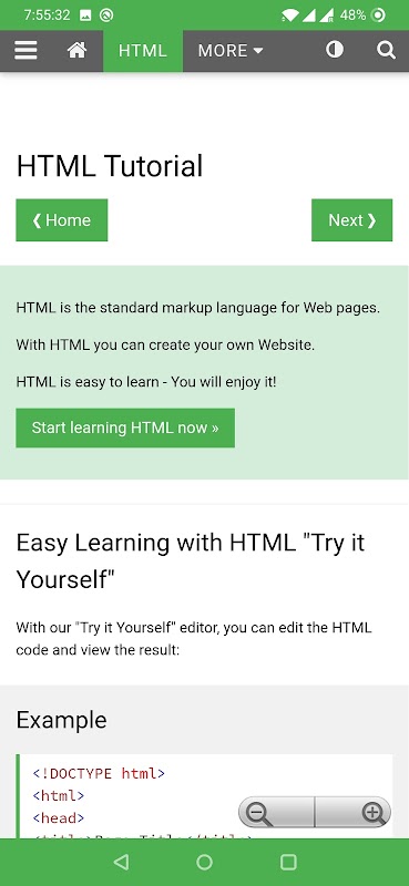 W3 Schools offline is an educational App for learning web technologies offline. Content includes tutorials and references relating to HTML, CSS, JavaScript, JSON, PHP, Python, AngularJS, SQL, Bootstrap, Node.js, jQuery, XQuery, AJAX, XML, and Java.