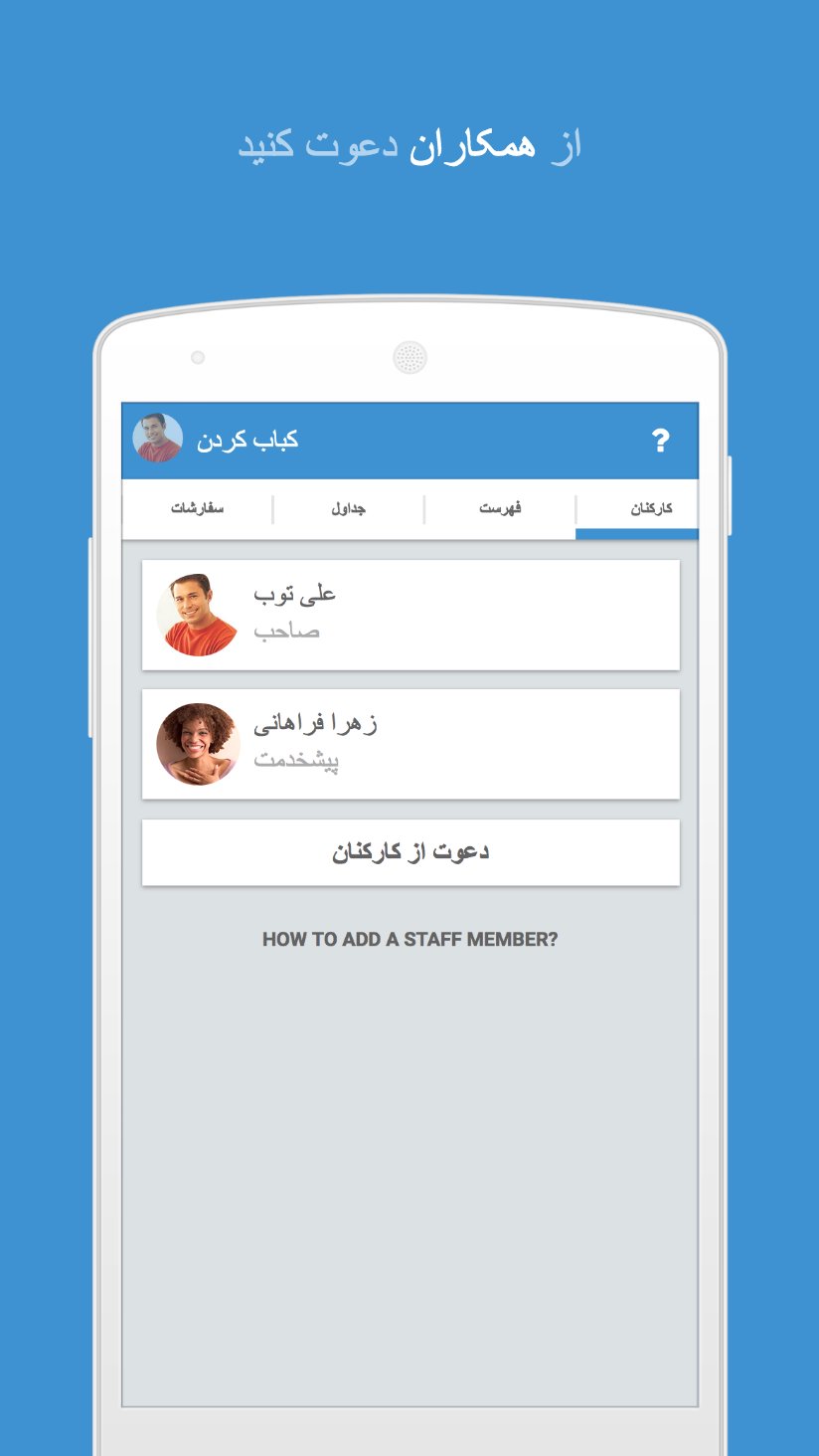 ► دعوت از همکاران همکار خود را دعوت از همکاران خود را به استفاده از Waiterio بنابراین سفارشات و منو به طور خودکار به اشتراک گذاشته می شود.