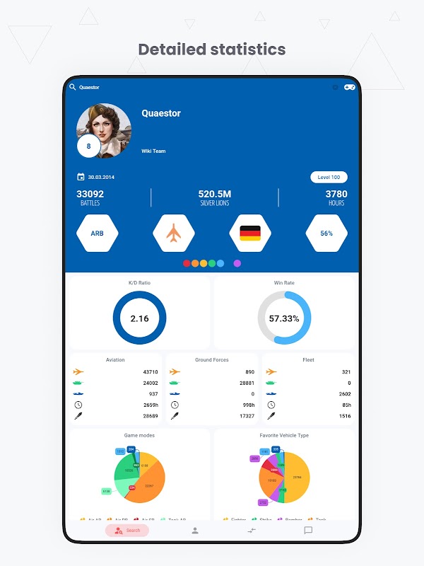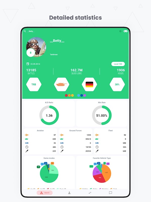 - تاریخ ثبت نام، تعداد نبردها، زمان صرف شده، شیرهای به دست آمده و غیره.