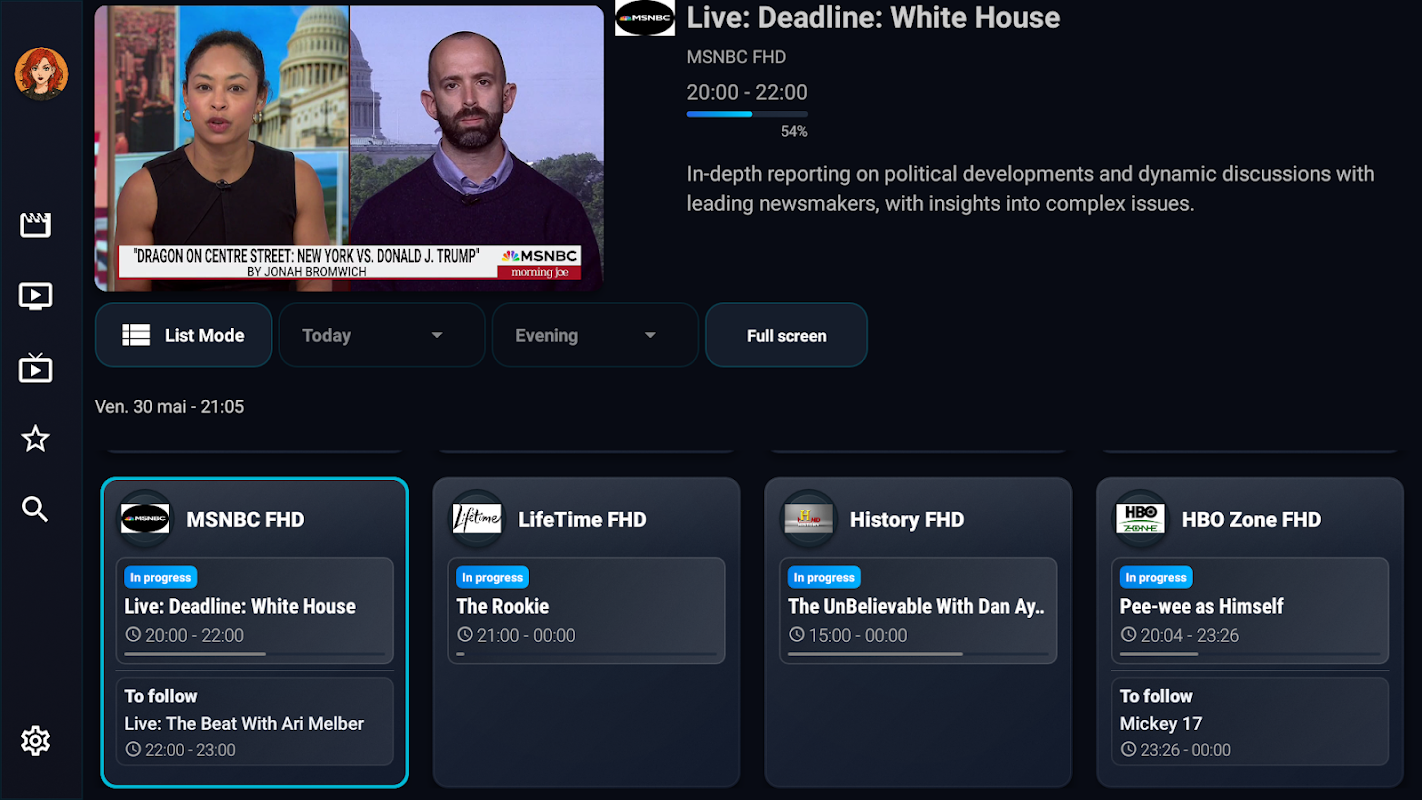 📺 ناوبری روان بین کانال ها و گروه ها، با حالت پیش نمایش زنده، حالت تمام صفحه، فهرست یا طرح شبکه برای EPG