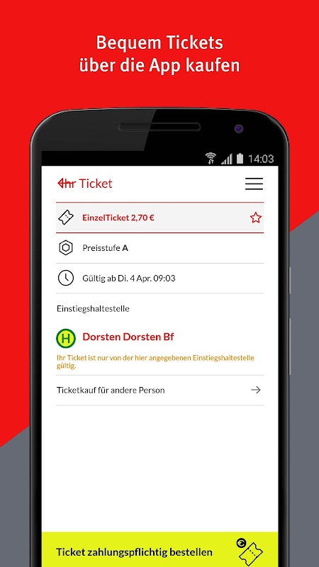 17.04.2018: Leider ist aus technischen Gründen bis auf weiteres kein Ticketkauf in unserer App möglich, die Fahrplanauskunft läuft weiterhin. Bitte entschuldigen Sie, dass Sie auf andere Verkaufsmöglichkeiten ausweichen müssen: HandyTicket Deutschland, Rheinbahn, Mutti, Essen Mobil oder DB Navigator.