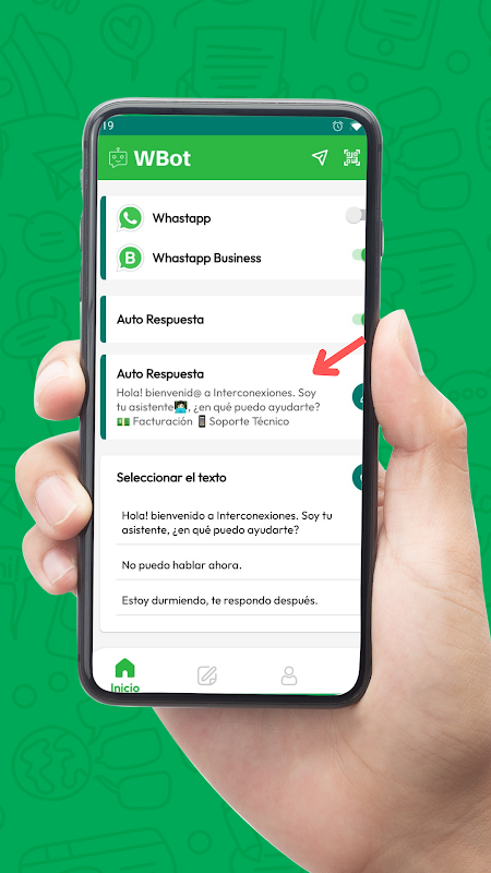 WBot به شما این امکان را می دهد که پاسخگوی خودکار را برای کسب و کار Whatsapp و Whatsapp خود پیکربندی کنید، برای مثال تصور کنید که مشغول هستید یا غایب هستید، اما نمی خواهید بدون پاسخ به مشتریان یا دوستان خود بروید، با Wbot می توانید یک پاسخ خودکار پیش فرض، WBot را پیکربندی کنید. پاسخگوی خودکار واتساپ است که شما نیاز دارید.
