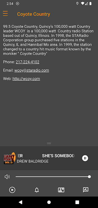 99.5 Coyote Country، Quincy's 100,000 WCOY Country leader WCOY یک ایستگاه رادیویی کشور 100000 وات است که در خارج از کوئینسی، ایلینوی واقع شده است. در سال 1998، گروه STARadio Corporation پنج ایستگاه در منطقه Quincy، IL و Hannibal، MO خریداری کرد. در سال 1999، این ایستگاه به یک فرمت موسیقی کانتری که با نام "Coyote Country" شناخته می شود تغییر یافت.