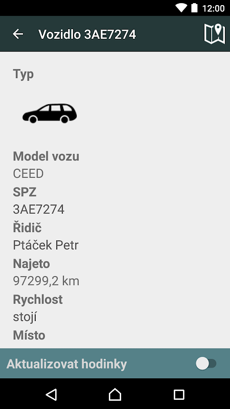 - rychlost a aktuální pozici vozidla včetně možnosti zobrazení na mapě