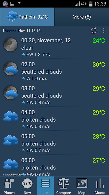 Weather forecasts usually made by using of weather forecasts models. Different weather forecast sources use different forecasts models. For to let you know which weather source is better for your location (or any world wide place), application gather forecast statistics by comparing current weather with that was predicted. Check internal application help for more details. All application widgets and views provides best (by statistics) data.