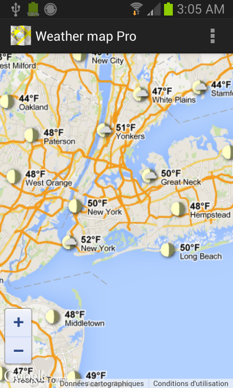 The Weather Map shows you the weather around your location. If you want, you can also view it all around you on a big scale, or even for every place in the world. Using Farenheit or Celsius degrees, forecasts can be viewed by the hour.