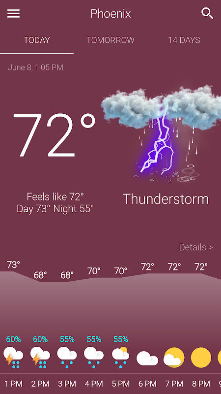 The current weather for today and the forecast for tomorrow are gorgeously animated. See realistic rain, snow or thunderstorm, sun rays for clear days, the moon’s glow and the stars at night, moving clouds and more weather animations. They all reflect the weather making it come alive.