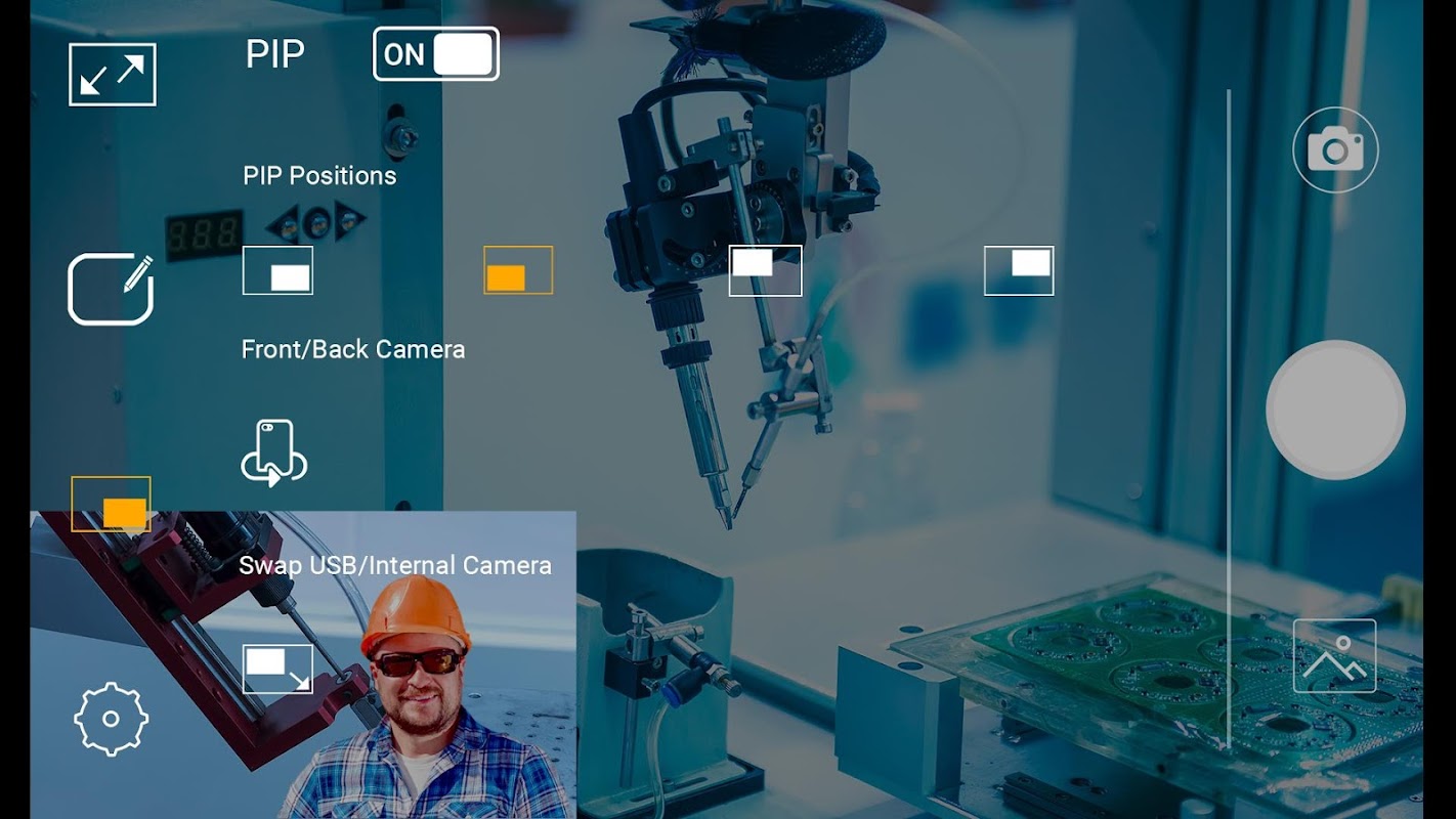 • با استفاده از PIP شما می توانید عکس ها را ضبط کرده یا فیلم ها را از 2 دوربین (یک دوربین USB متصل و دوربین جلویی دیگر دستگاه خود) ضبط کنید. خروجی از محل دوربین جلو / عقب شما می تواند به هر یک از 4 گوشه تغییر کند.