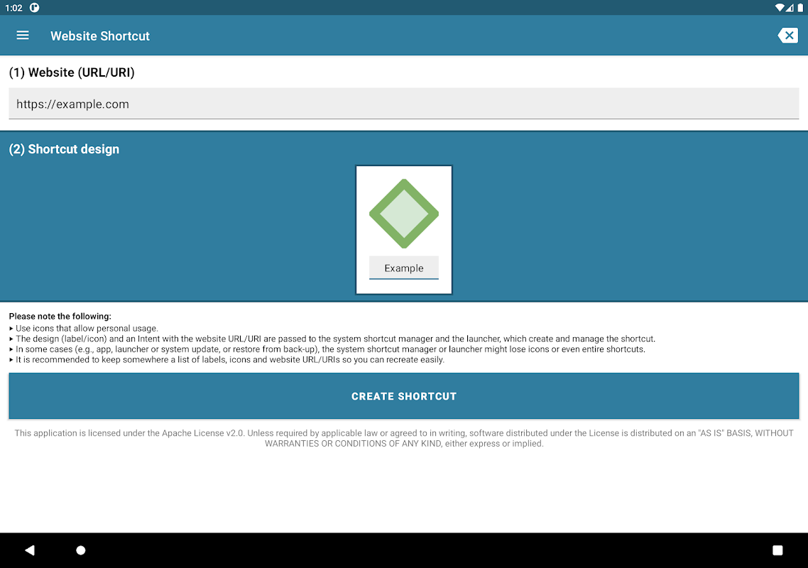 ایجاد میانبر با ارسال طرح میانبر (برچسب/آیکون) و یک Intent با وب سایت (URL/URI) به مدیر میانبر سیستم و راهانداز انجام میشود. مدیر میانبر سیستم و راه انداز میانبرها را ایجاد و مدیریت می کنند و آنها را با Intent های مرتبط خود نگهداری می کنند. در برخی موارد (به عنوان مثال، پس از بهروزرسانی برنامه، راهانداز یا سیستم، یا بازیابی از پشتیبانگیری)، مدیر میانبر یا راهانداز سیستم ممکن است نمادهای میانبرهای موجود یا حتی کل میانبرها را از دست بدهد. توصیه می شود لیستی از برچسب ها، نمادها و URL/URI های وب سایت را در جایی نگه دارید تا بتوانید به راحتی دوباره ایجاد کنید. در منوی کشوی برنامه، میتوانید «میانبرهای فعلی» را باز کنید که برچسبها و URL/URIهای وبسایت میانبرهای بازیابی شده از مدیر میانبر سیستم را نشان میدهد.