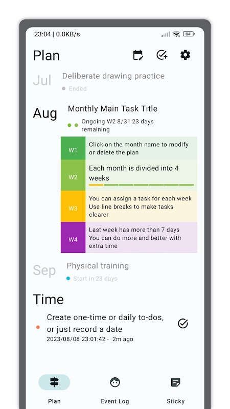 برنامه ریز وظایف هفتگی از تقسیم ماه به 4 هفته پشتیبانی می کند، هر هفته یک نشانگر پیشرفت دارد، معمولا یک هفته به عنوان 7 روز تعریف می شود، در بیشتر موارد هفته چهارم بیشتر از 7 روز است، می توانید از زمان اضافی برای تکمیل قبل از کارهای ناتمام استفاده کنید. ، یا انجام کارهای بیشتر یا انجام کارهای بهتر، البته می تواند برای استراحت نیز استفاده شود.