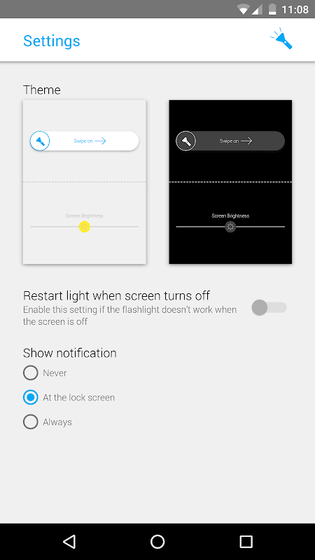 • A notification is shown that allows you to turn on the light. This can be set to always visible, never visible, or only visible at the lock screen. This requires a new permission (start when Android starts) to show the notification as soon as your phone turns on, before you open the app.