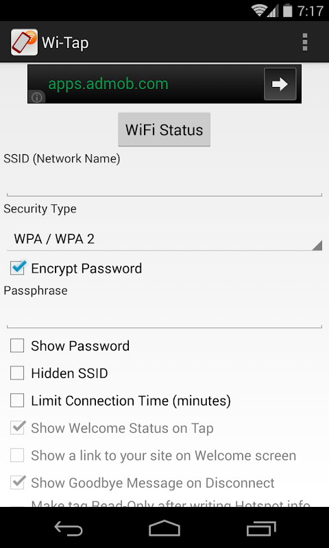 A new, flexible way to allow devices to connect to your WiFi network! Once the tag is written, all your visitors need to do is tap their NFC Compatible device to the NFC tag and the app (once installed) takes care of the rest! Features supported: