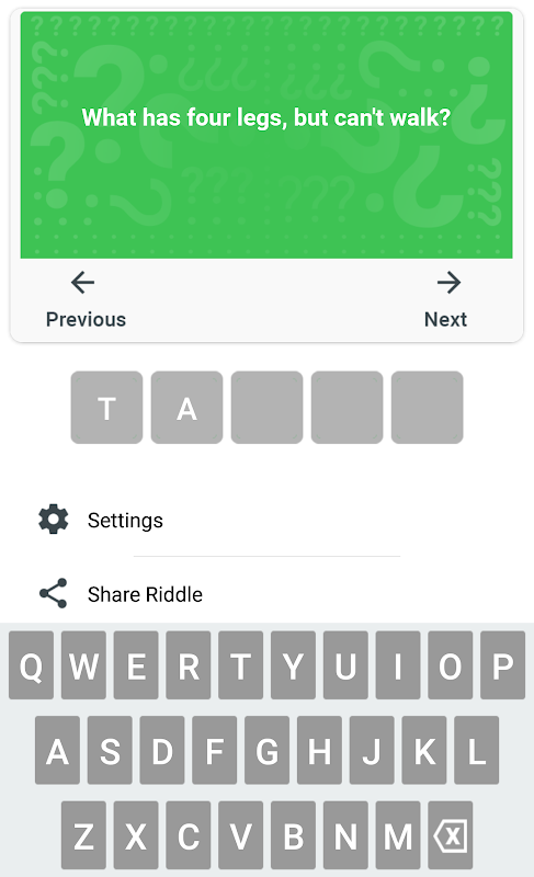 If you love spending your time playing puzzle games, this is the right app for you. Widget With Best Riddles - Riddles And Answers available for your device right now. Pleasant, user friendly interface and extremely smart and fun game. Daily dose of brain teasers. Learn and have fun. Thousands of riddles to boost your memory and your brain power. Do your best and solve them all! Challenging riddles for all ages – riddle games for kids and adults. Check how smart and fast you are and practice everyday. Download now and play everyday.