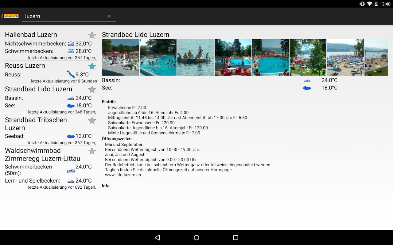 ایده آل برای پیدا کردن چگونه گرم آب در بدیع خود را. می Badis های مختلف (رودخانه، دریاچه، استخر شنا، استخر سرپوشیده) در پایگاه داده از wiewarm.ch وجود دارد. درجه حرارت با توجه به بدیع فعلی متفاوت است. این بستگی به Badibetreibern چگونه اغلب آنها aktuallisieren درجه حرارت آب.