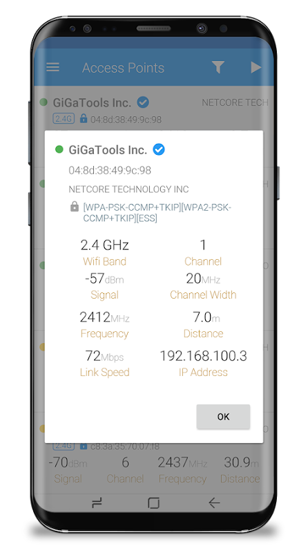WiFi Tools scan all WiFi networks around you and provide much info such as wifi name, router’s MAC address, signal strength, distance from router to you, frequency, working channel, manufacturer, WiFi band, and capabilities.