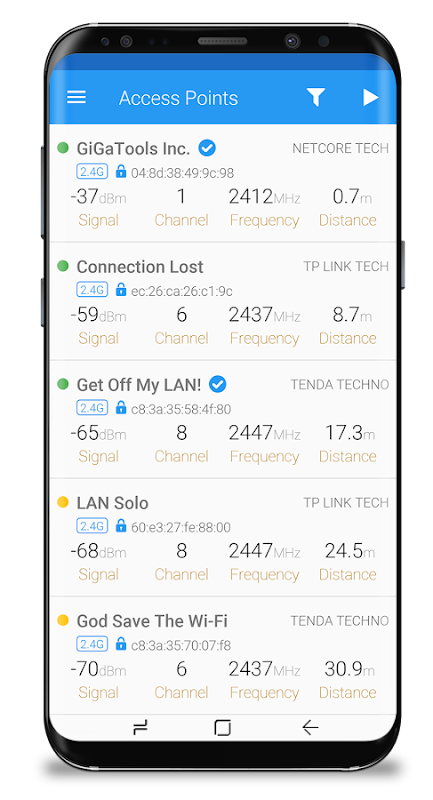 You can filter the WiFi networks by name, WiFi band, signal strength, security type.