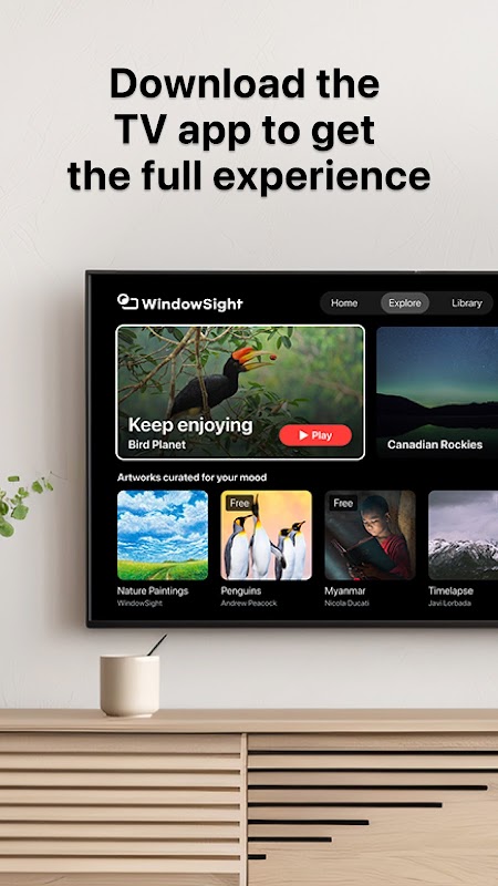 صفحه سیاه خود را به یک بوم زنده یا یک پنجره باز تبدیل کنید. WindowSight هنر بصری و عکاسی از خالقان مشهور جهانی را مستقیماً به تلویزیون شما میآورد و هر فضایی را به مکانی الهامبخش و پویا تبدیل میکند.