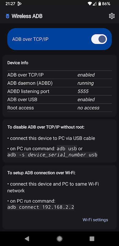 برنامه استفاده از ADB (Android Debug Bridge) را روی شبکه TCP/IP (مانند WiFi) بدون جفت شدن آسان می کند، در دستگاه های روت شده ADB را از طریق TCP/IP بدون اتصال USB فعال می کند.