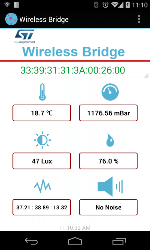 The Android App is to demonstrate Internet of Things using STMicroelectronics Wireless Bridge Board (STEVAL-IDI004V2) and Sensor Nodes (STEVAL-IDI002V2 and STEVALIDI003V2)