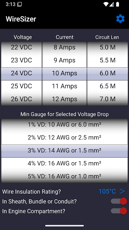 به سادگی ولتاژ DC، جریان و طول کل مدار خود را با حرکت انگشت خود انتخاب کنید. بدون نیاز به صفحه کلید. WireSizer فوراً اندازه سیم صحیح را برای درصد افت ولتاژ مورد نیاز شما محاسبه میکند.