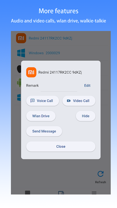 این برنامه همچنین دارای ویژگیهایی مانند واکی تاکی، تماسهای صوتی و تصویری و یک فضای ابری محلی است. با وارد کردن IP محلی تلفن با پورت ۸۸۸۸ و مسیر 'explorer' در مرورگر (به عنوان مثال، ۱۹۲.۱۶۸.۱.۴۳:۸۸۸۸/explorer)، میتوانید تصاویر و اسناد را در تلفن خود به صورت آنلاین مشاهده کنید و فایلهای صوتی و تصویری را پخش کنید. برای فرمتهای صوتی و تصویری پشتیبانی نشده، میتوانید از یک پخشکننده شخص ثالث استفاده کنید (برای مثال، نصب پخشکننده VLC به شما امکان پخش ویدیوهای rmvb را میدهد).