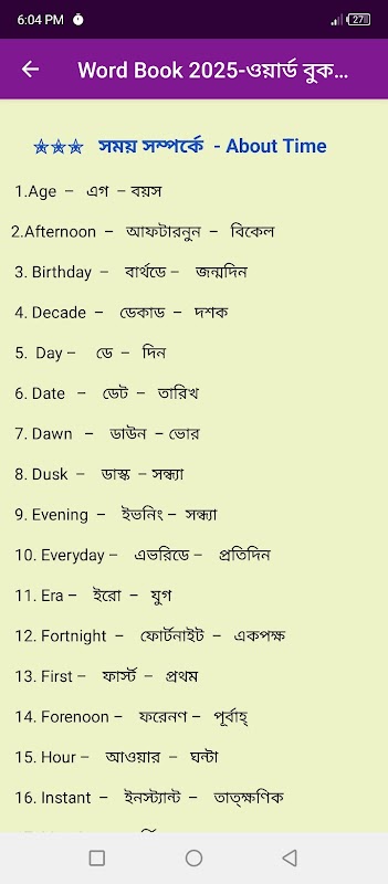 با این برنامه می توانید هر کتاب ورد انگلیسی به Bangla را یاد بگیرید. اگر می خواهید انگلیسی یاد بگیرید، باید همه کلمات آن زبان را بدانید، از تمام حروف الفبا شروع کنید. تا بتوانید به راحتی با کلمات جمله بسازید.