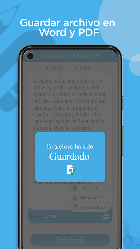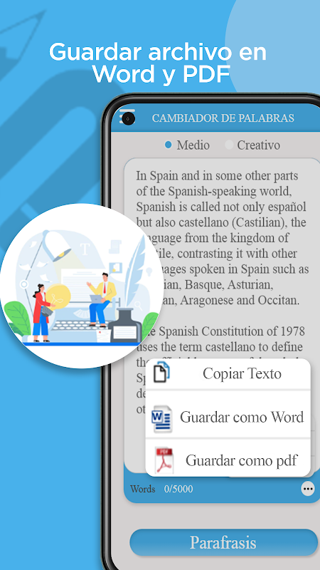 برای استفاده از این برنامه شگفت انگیز از (https://cambiadordepalabras.com)، فقط باید آن را از فروشگاه Play نصب کنید. نصب این برنامه اندروید کاملا رایگان است و استفاده نامحدودی دارد.