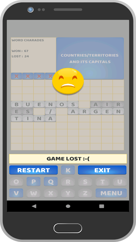 "Word Charades" بازسازی شده از بازی محبوب محبوب حدس کلمات است که متناسب با سلیقه و تکنولوژی روز طراحی شده است. حروف را حدس بزنید و ببینید که پاسخ به طرز جادویی خودش را نشان می دهد برای هر حدس درست. موضوعات مختلف مختلف مانند پایتخت ها ، کشورها ، ضرب المثل ها ، تعطیلات جهانی ، تیم های ورزشی ، آیکون های ورزشی ، آهنگ ها ، فیلم ها ، پرندگان ، حیوانات ، جهان و موارد دیگر ، در این بازی کوچک اما قدرتمند قرار گرفته اند. خود را درگیر کار کنید ، و همچنین به طور شگفت آور کلمات ، جملات جدید و غیره را بیاموزید. نسخه های آینده شامل موضوعات متنوع جدید است.
