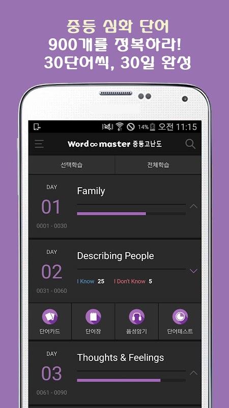 3. 음성암기 : 총 900단어에 대한 원어민 음성을 통해 정확한 발음 듣기는 물론 반복 청취 학습 및 암기가 가능합니다. 또한 듣기설정을 통해 맞춤 듣기 학습이 가능합니다.