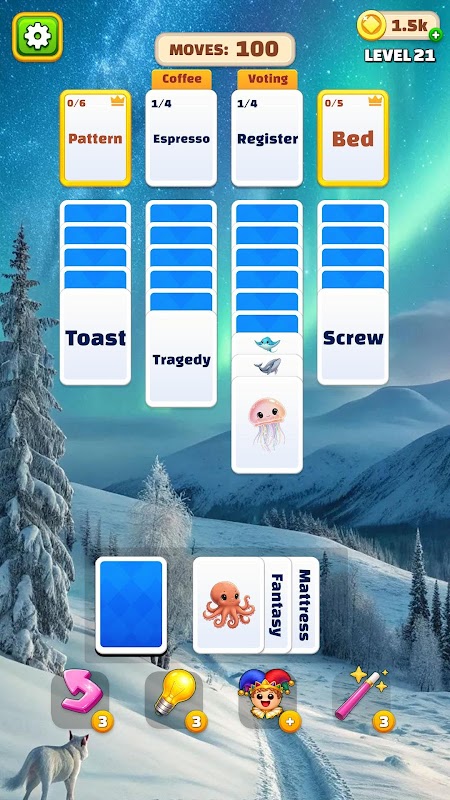 هر مرحله با یک تخته کامل از کارتها، درست مانند بازی تکنفره سنتی، آغاز میشود. ابتدا یک کارت دستهبندی را روی تخته قرار میدهید. سپس، کارتهای کلمات را با دقت در دستهای که به آن تعلق دارند، قرار میدهید. هر حرکت مهم است، بنابراین باید از قبل فکر کنید و عاقلانه برنامهریزی کنید.