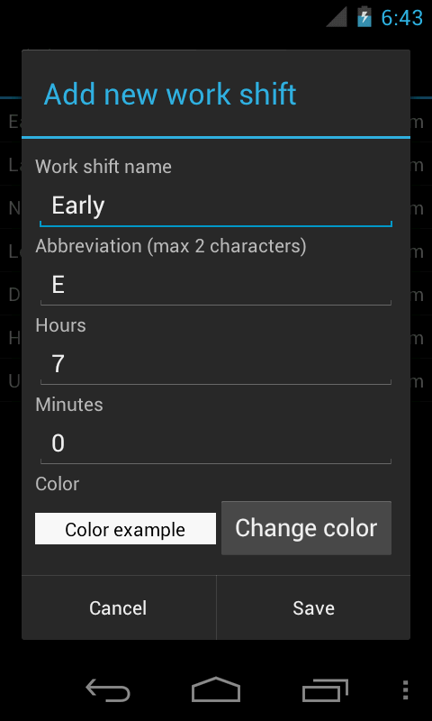 You can create your own work shifts (you can customize name, abbreviation, hours and colors) to adapt the application to your needs.