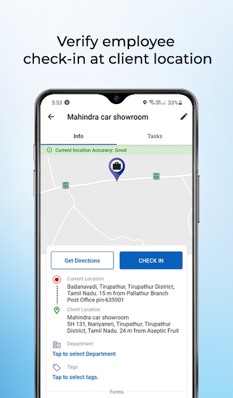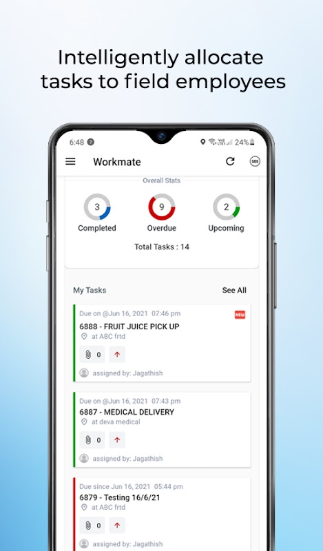 دقیق: - WorkMate با استفاده از داده های نقشه MapmyIndia فراهم می کند که مجموعه ای دقیق از تایید نقاط نقشه داده برای هند را به سطح خانه تعداد.