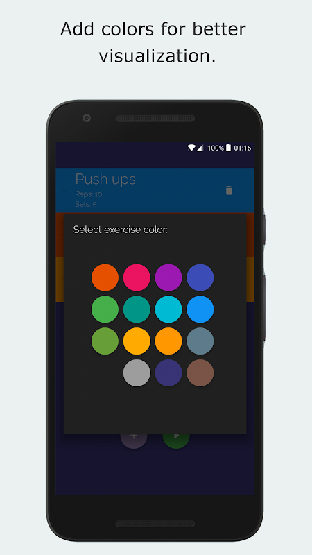 This universal workout interval timer allows user to create his own exercise and training plans by simple adding unlimited number of individual exercises. Every individual exercise can be easily customized using various timers.