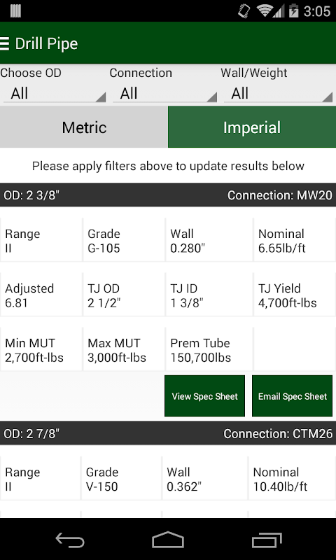 The App allows users to access specifications for the most commonly used sizes and connections of drill pipe, landing string, HWDP, drill collars and tubing providing the option to view and email specification sheets conveniently using your mobile device.