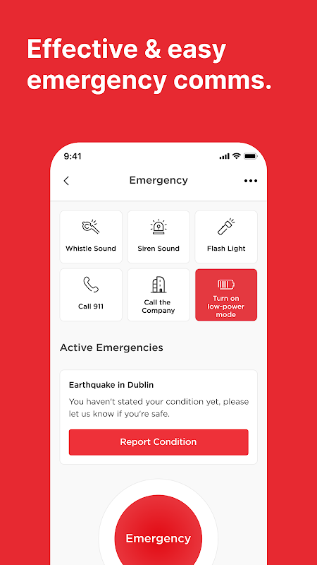 با برنامه اضطراری؛ موارد اضطراری را می توان به طور موثر از طریق اعلان های فشاری اعلام و به روز کرد و ارتباطات بی وقفه را ارائه می دهد. کارمندان با وضعیت ایمنی و موقعیت مکانی که در زمان واقعی با مدیران به اشتراک گذاشته می شود پاسخ می دهند. به علاوه، ارسال پیام به مخاطبین اضطراری یا تماس با خطوط اضطراری کمتر از یک دقیقه طول می کشد.