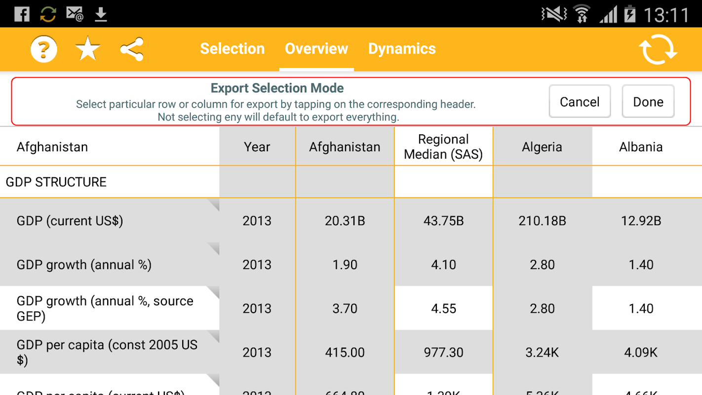 • WB MacroStats combines data access on the go with an appealing visual analysis. The app was exclusively designed for mobile platforms, and it features dynamic bubble charts and customizable tables that can be easily exported by the user. • WB MacroStats uses a simple algorithm with two customizable criteria (per default, GDP per capita and population) and adjustable weights that allows for the automatic selection of peer countries.