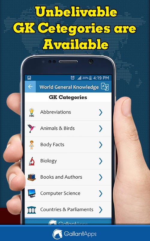 برنامه دانش عمومی جهانی (انگلیسی) با پرسش و پاسخ است. بیش از 15000 پرسش و پاسخ GK در دسته های مختلف اضافه شده است. و بسیاری دیگر با به روز رسانی های آینده.