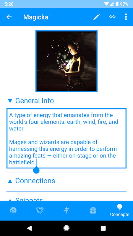 & # 8195؛ * مفاهیم - تعاریفی برای ایده های خاص جهان مانند سیستم های جادویی ، ادیان و ابرقدرت ها