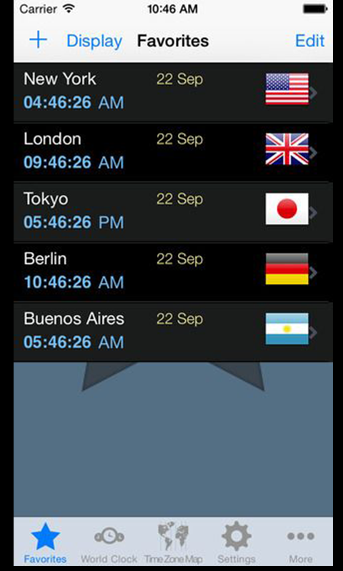 Just like in any other clock or time display app on the market, the world time app displays the time in your time zone in real time world time as two distinctly separate or wholly combined format as