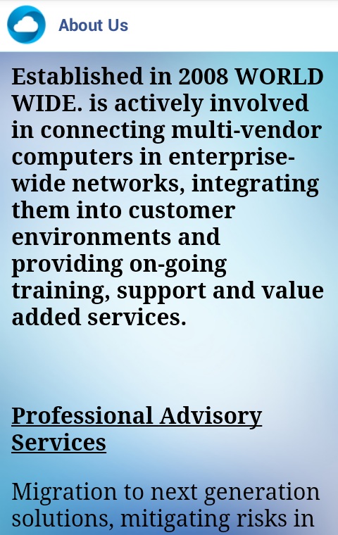Established in 2008 WORLD WIDE. is actively involved in connecting multi-vendor computers in enterprise-wide networks, integrating them into customer environments and providing on-going training, support and value added services.