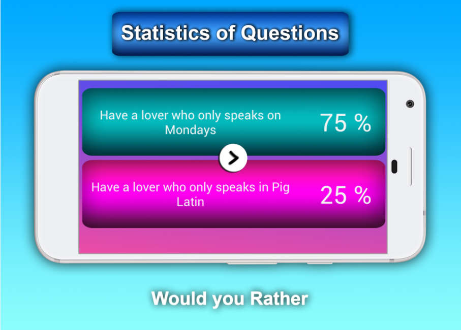 Would You Rather a fun game that contains a large number of interesting questions and at the same time gives you statistics about the answers you have chosen So you'll face a bunch of questions that can be played with your friends