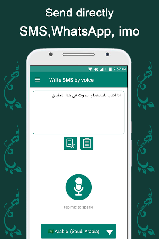 پس از دریافت SMS خود را در فرم متن، آن را کپی کنید. شما می توانید اس ام اس یا متن خود را از طریق WhatsApp، Messenger، IMO، توییتر، ایمیل و فیس بوک به اشتراک بگذارید. در برنامه "ارسال SMS توسط صدا"، بیش از صد زبان جهان در دسترس است که در کشورهای مختلف جهان صحبت می شود. شما فقط زبان مورد نظر خود را انتخاب کرده و صحبت می کنید. صدای شما به صورت خودکار در برنامه "ارسال SMS توسط صدا" تبدیل به زبان انتخاب شده می شود.