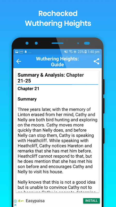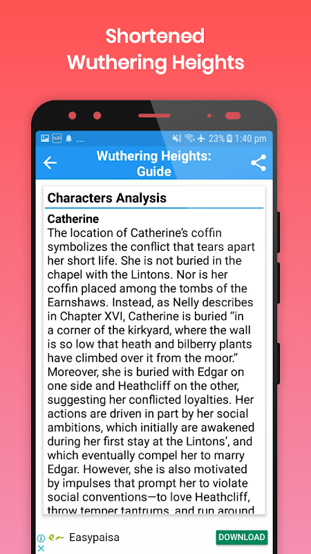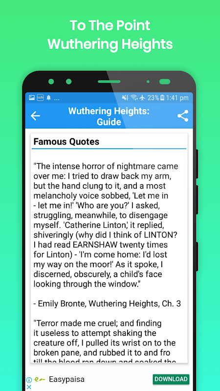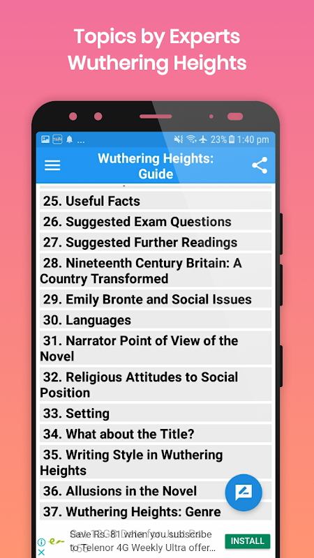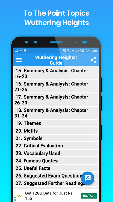 This Guide app works both online and offline, and contains 37 basic topics about one of the famous novels of Emily Bronte, Wuthering Heights.