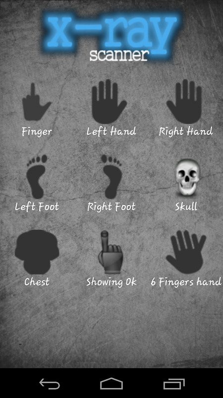 Please tilt your phone over the body part where you want the x ray image, like if you want X-Ray of legs, then move the phone over the leg after pressing leg scan button and see the xray of leg. Similarly you can do for fingers, legs, head and hands, left feet, right feet and more.