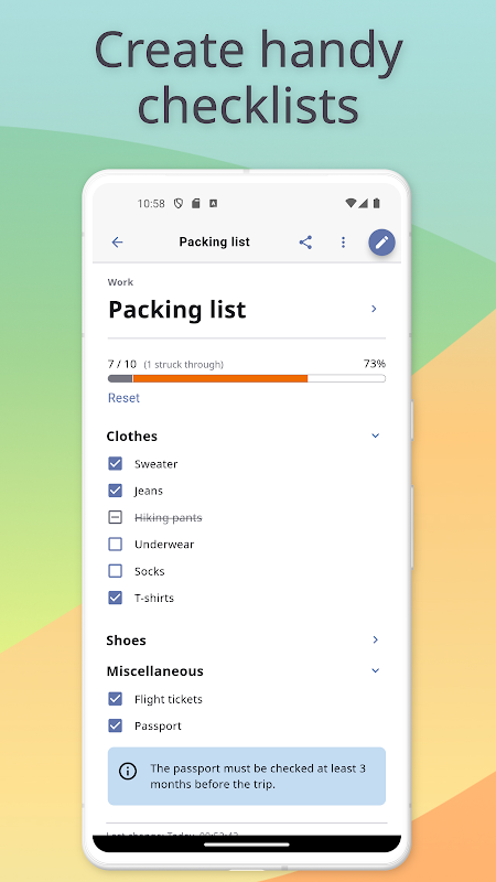 به لطف کارکرد آسان و قالبهای بخشبندی شدهی خوب، میتوانید اطلاعات خود را به راحتی و مرتب گردآوری کنید. به این ترتیب، وقت ارزشمند خود را برای قالببندی متن یا درج تصاویر تلف نمیکنید. حالت نمایش خوانا به شما امکان میدهد بعداً به راحتی محتوا را جستجو کنید. تغییر اشتباه محتوا غیرممکن است - هوشمند و ساده.