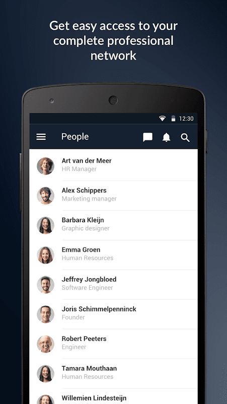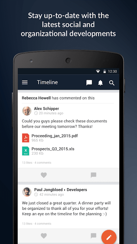 دانش ، ایده ها و دستاوردهای داخلی جدید را به سرعت و به راحتی با سایر اعضای تیم ، بخش یا سازمان خود به اشتراک بگذارید. پیام ها را با تصاویر ، فیلم ها و شکلک ها غنی کنید. به سادگی پست های جدید از همکاران ، سازمان و شرکای خود را پیگیری کنید.